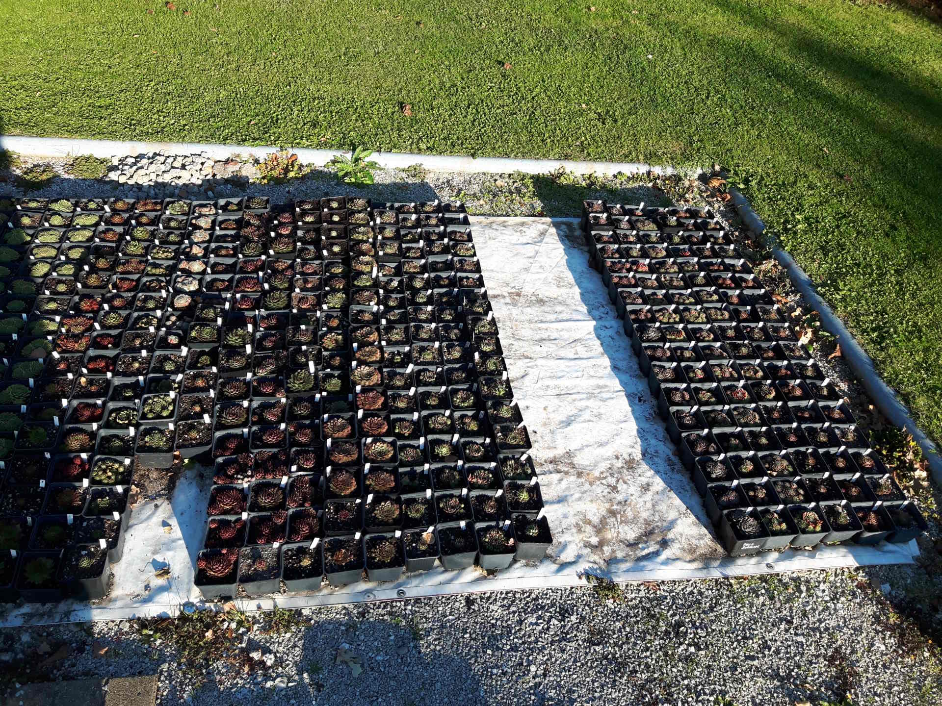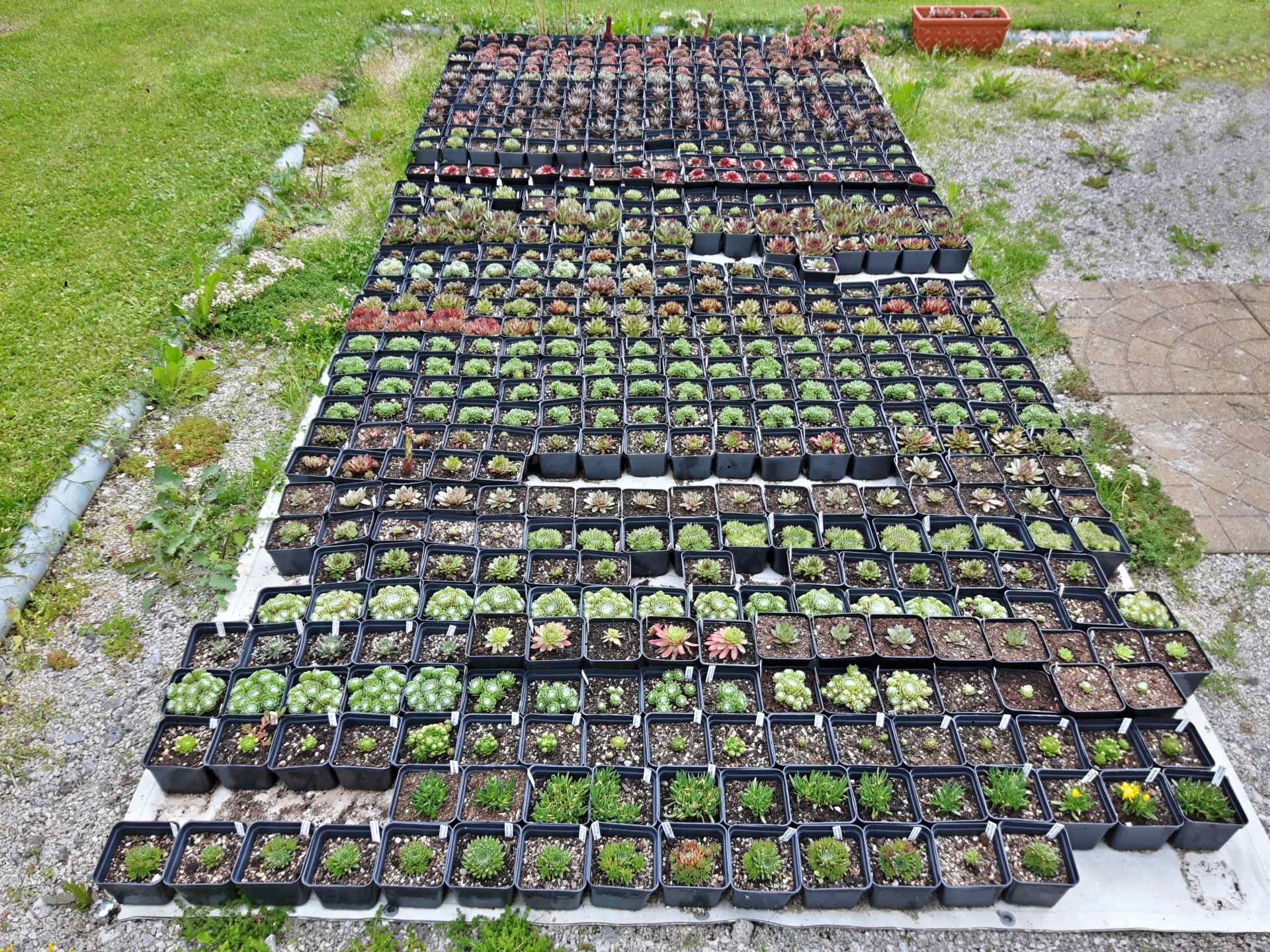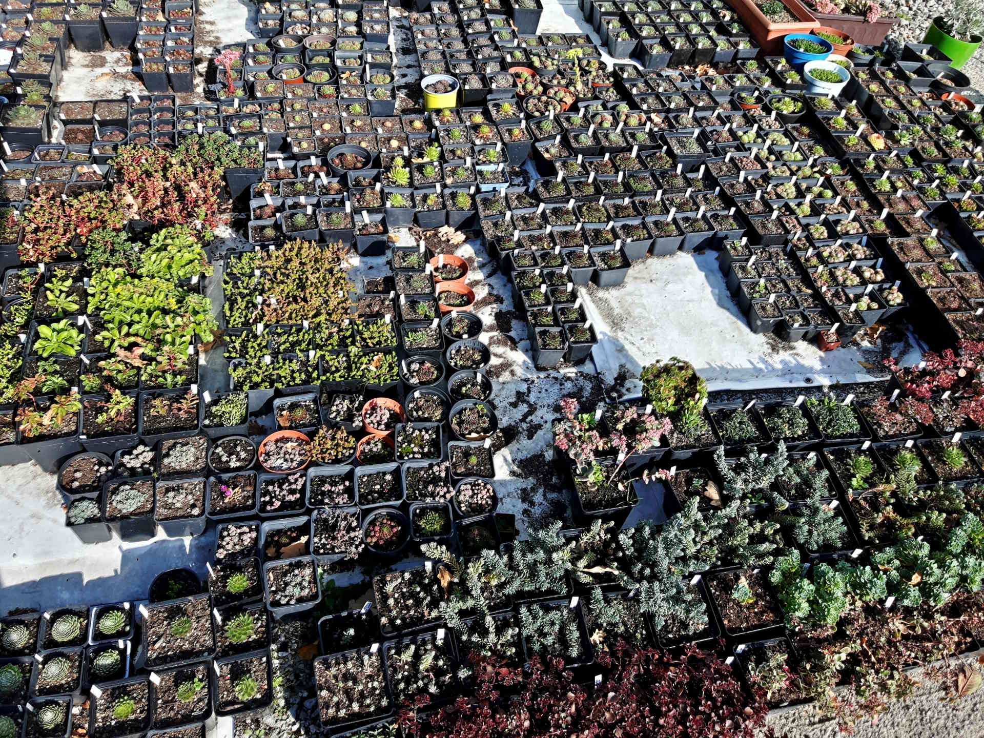 Pohled do naší skalničkové školky - netřesky, orostachysy, rozchodníky a kosmatce na prodej.