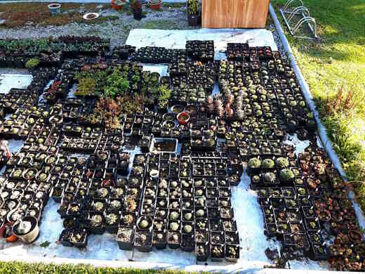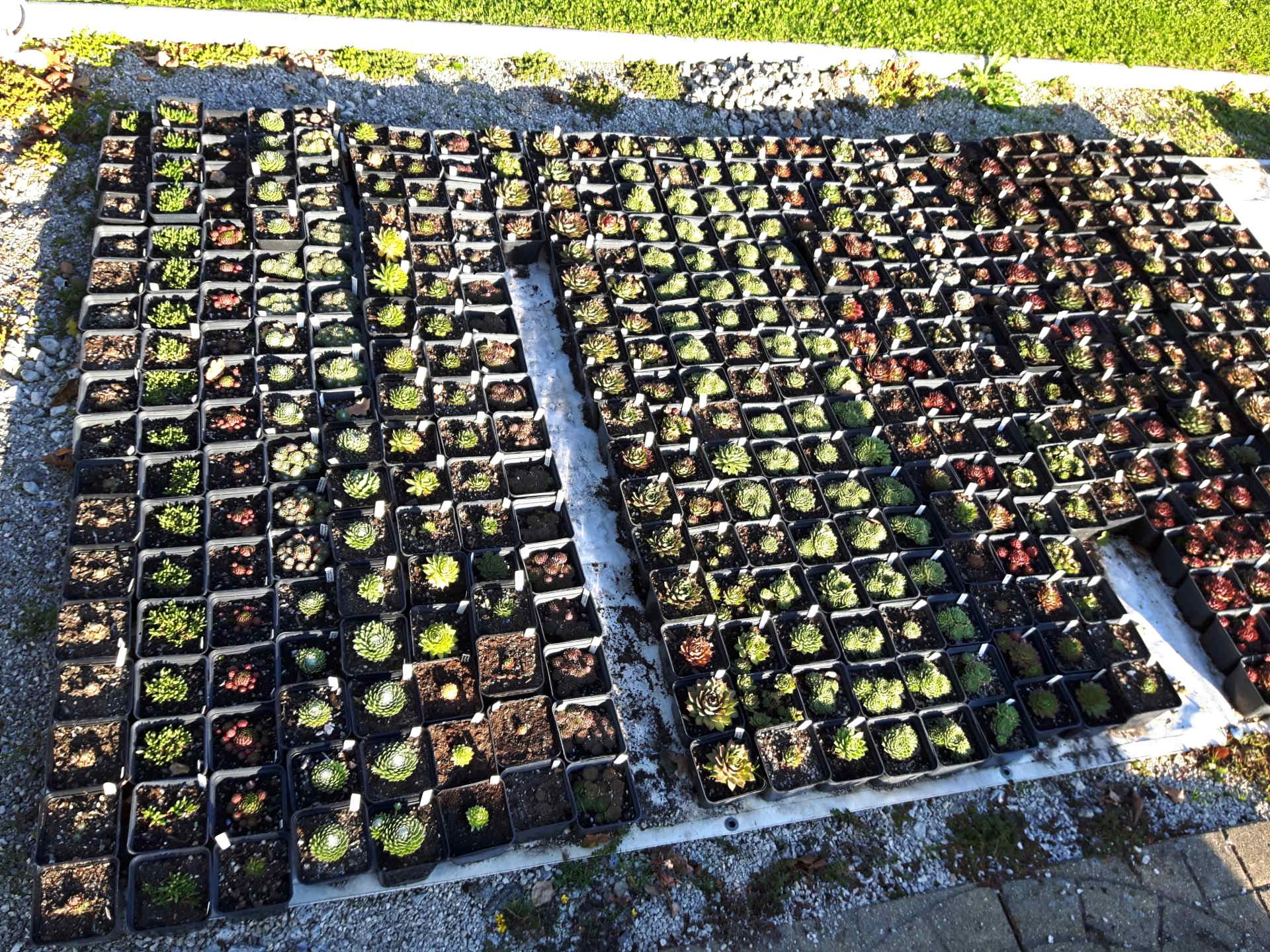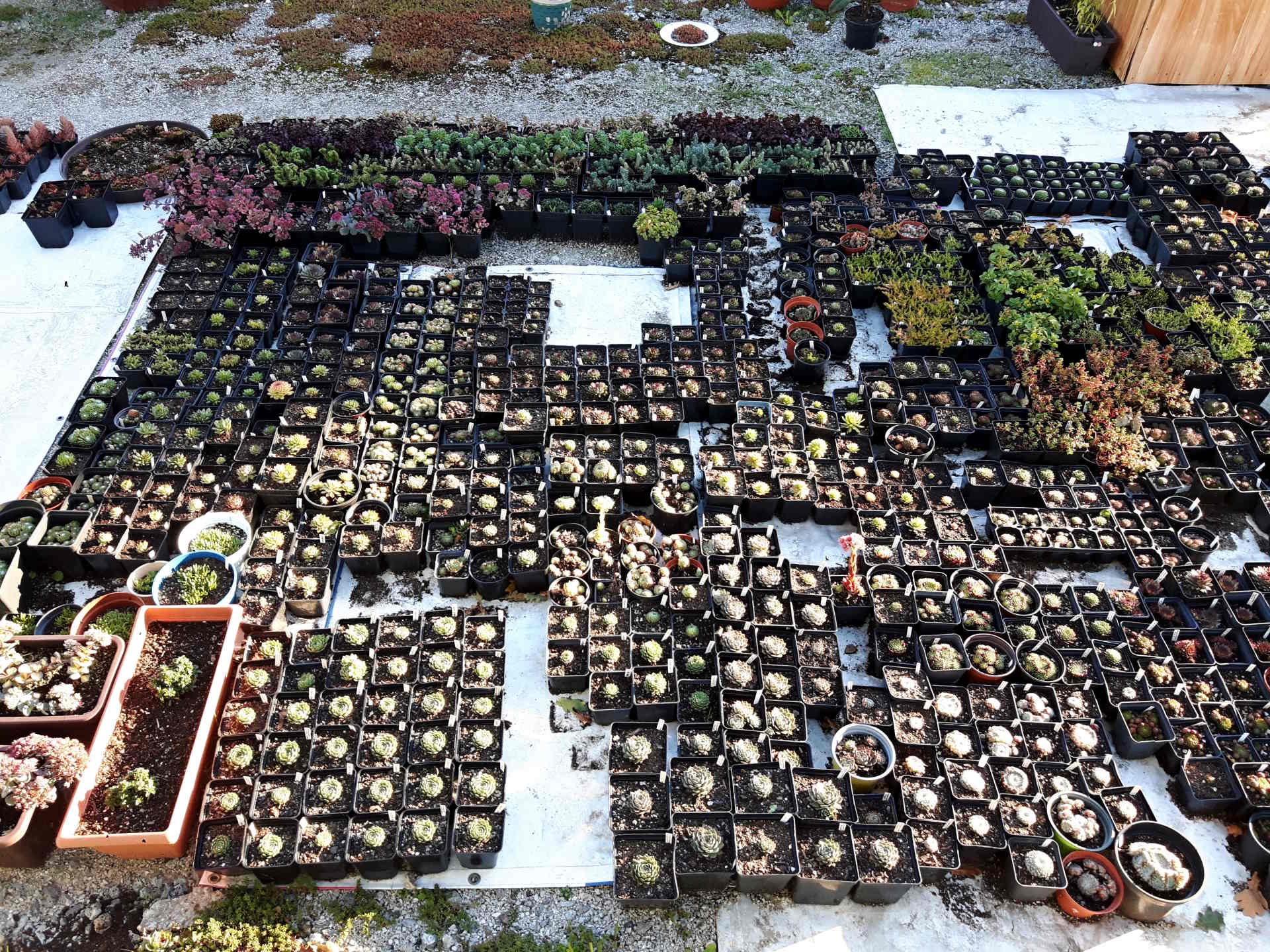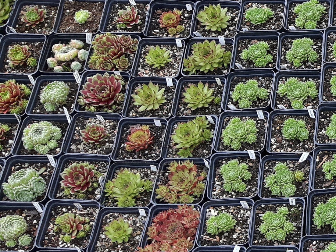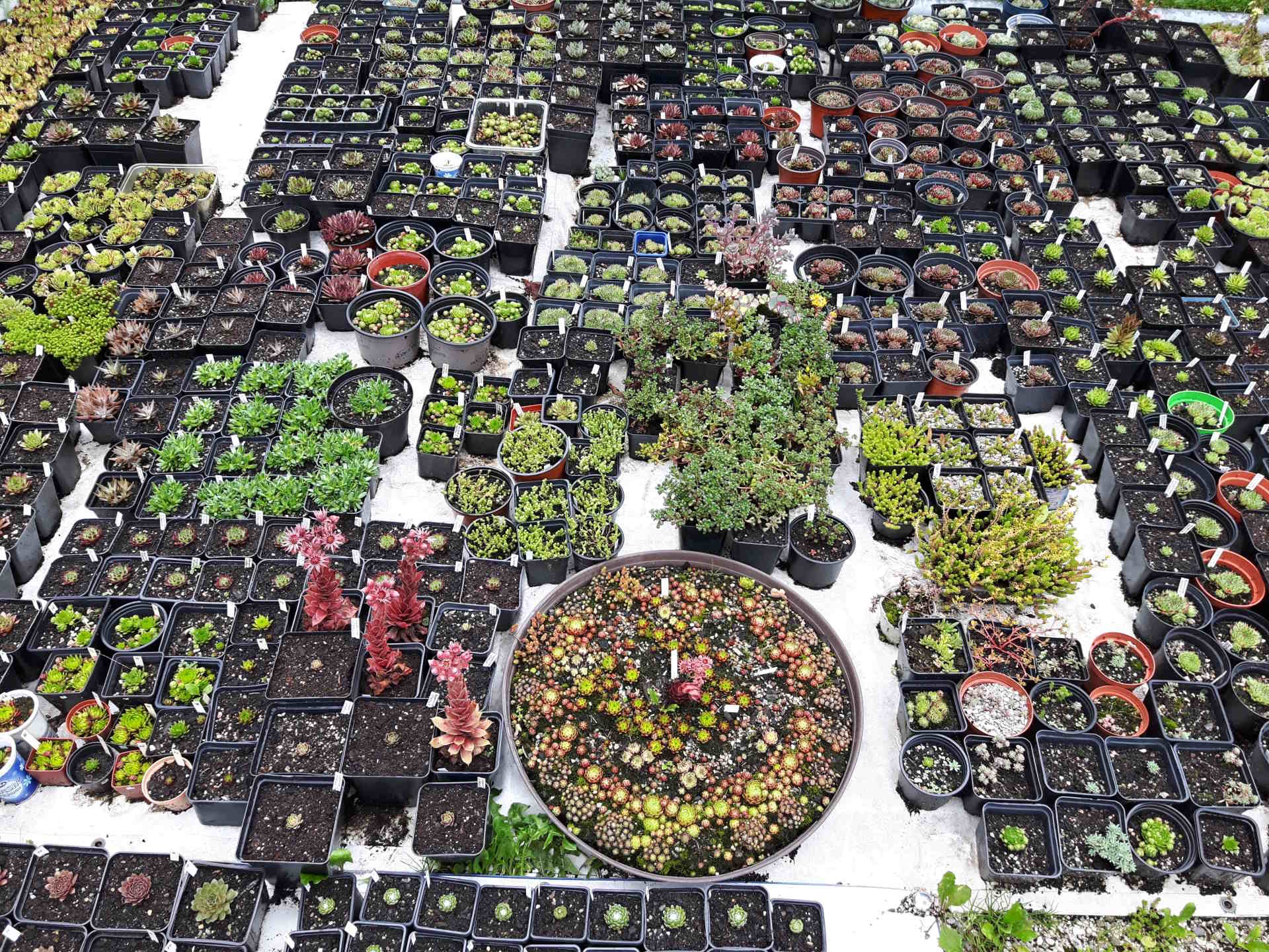 Pohled do naší skalničkové školky - netřesky, orostachysy, rozchodníky a kosmatce na prodej.
