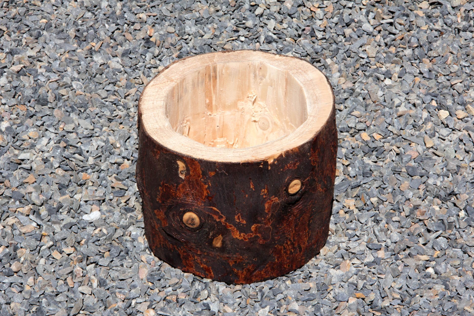 Dřevěný, ručně dlabaný květináč bez kůry.